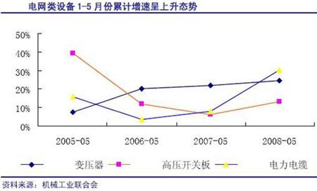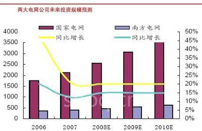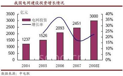 2007年,我国完成电网投资2451亿元,同比增长16%,2008年上半年完成电网投资1190亿元,同比增长27%。按照国家电网、南方电网修正后十一五投资计划11300亿元、3042亿元测算,合计13541亿元,年复合增长率达20%,年均投资超过2600亿元,同比“十五”期间超过100%,按照国家电网公司2006年、2007年两年的投资状况,我们预计未来三年电网投资复合增长率将达到20%左右。