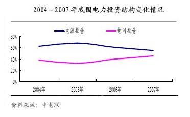 从保证电网安全和提高输送效率方面出发,国家从2005年开始就逐步加大电网领域的投资力度,从而使得电网投资在整个电力投资中的比例得到提升。2007年全国电力基本建设投资完成5493亿元,同比增长3.87%,其中发电基本建设投资完成3042亿元,同比降低4.81%,连续两年出现回落,其占电力投资比重由2006年的60.42%下降到2007年的55.37%;电网基本建设投资为2451亿元,同比增长17.1%,电网投资比重由2006年的39.58%上升到2007年的44.63%。随着电网投资比重的逐步增加,过去电源投资规模过大、增速过快、比例过高的发展严重失衡的状况逐步得到改善。