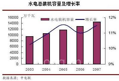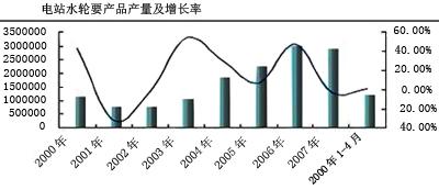 截至2007年底,我国水电装机容量已经达到1.45亿千瓦,07年新增水电装机1536万千瓦。水电总装机容量及增长率见图6。电站水轮机产品产量及增长率见图7。要达到2010年的目标,未来三年,年均新增达到1500万千瓦即可满足,与07年新增量持平。按照《可再生能源中长期发展规划》,至2010年我国水电装机达到1.9亿千瓦,其中大型1.4亿千瓦,“十一五”期间新增装机7300万千瓦。“十二五”期间,我国还将进一步加大水电投资规模,“十二五”期末我国水电装机容量将达到2.3亿千瓦,占到总装机容量的25%,期间年均投资额将达到750亿元。到2020年,我国水电装机容量达到3亿千瓦,其中大中型水电2.25亿千瓦。要完成2020年目标,2010年之后年均新增1100万千瓦即可。因此,水电新增装机总体是平稳的。
