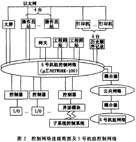 HIACS-5000M采用环状通信方式,可靠性较高。外高桥电厂二期(2×90OMW)机组设计有3个环状的控制网络,分别是 5号机组控制网络、6号机组控制网络以及公用系统控制网络。每个环网是由μΣNETW0RK-100。双路光缆进行连接,每个控制网络之间通过藕合器进行连接,实现数据传输。控制网络连接简图如图l所示。每个控制网络通过GATWAY与SIS进行连接,实现全厂的DCS总网络。总网络连接简图见图2。