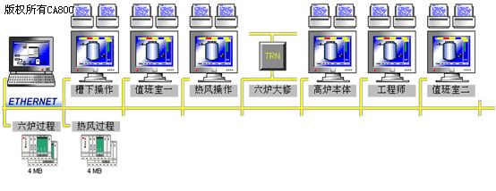 用于对各工艺过程及参数进行监控,显示生产流程画面,趋势画面,记录,报警等的组态。槽下配有2台工控机作为操作站,用于对槽下上料及炉顶上料的监控。六炉主控室也有两台操作站,用于高炉自控系统运行状态的监控及上料料单的设定等。在热风操作室,配有1台工控机作为操作站,对四座热风的状态进行监控。