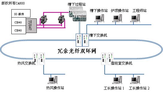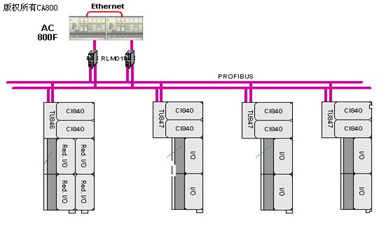 根据工艺要求,整个控制系统由两个过程站完成,槽下过程站和热风过程站。槽下过程站位于槽下,用于对槽下上料、炉顶上料的自动控制,热风炉过程站,位于热风操作室,用于热风炉和高炉的各种温度、压力、流量等仪表信号的采集。两个过程站均采用冗余AC800F控制器。现场控制器AC800F下挂S800 I/O模件,之间的通讯采用Profibus DP现场总线协议。AC800F现场控制器的Profibus模件(FI830)与冗余连接模件 (RLM01) 经Profibus DP线连接,再连接到CI840 模件,CI840是标准Profibus-DP/DPV1全冗余通信接口,CI840通过配套TU847底座实现冗余连接,保证了数据通讯的可靠性。下图是AC800F现场控制器与S800 I/O站之间的连接图。