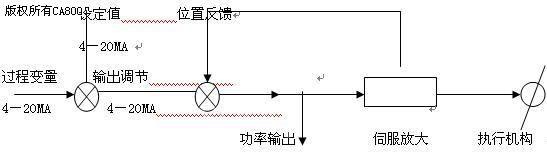 调节阀的自动控制原理是:由调节仪表给进来的4――20MA模拟输入信号接入过程站的模拟输入(DAI05)模件,经AD转换后与计算机内的调节阀阀位信号进行比较,根据差值输出相应的开关信号用于驱动伺服电机正反向转动,经机械减速变换后驱动阀门,输出4――20MA模拟信号供系统显示跟踪控制,控制原理图如下: