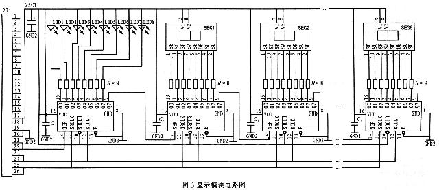 显示驱动采用SN74HC595,是一款串行输入并行输出的移位寄存器,仅需3根I/O端口线即可控制6个数码管和8个发光二极管,极大节省了单片机的资源,电路如图3所示。