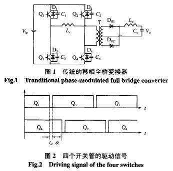但是,对于滞后桥臂(Q2、Q4},当它关断时,在死区时间td内的续流电流反向经过电源vin,续流电流急剧下降。这种电流的急剧变化,在副边形成较大的反向电压,导致二极管DRI或Dx2中未开通的那只二极管开通,而原己开通的二极管因有一段复合时间未全关断,在副边形成DR,和DR:同时开通,形成通过2个二极管短路的状态。这样便切断了副边反射电感n2Lo,使参与原边谐振的电感量剧减到只剩下1.r,电感储能相应急剧减少,使在死区时间td内相应并联电容充放电的过程减缓,在经过Zd时刻后,相应的滞后桥臂开关管开通时不能处于零电压状态,无法实现零电压开关。