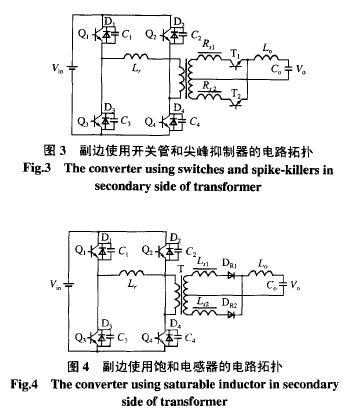 变压器副边使用饱和电感器的电路(图4)工作原理与上述的情况基本相同,区别在于:图3电路中,t:时刻关断Q4后,变压器副边绕组下半部分电流箱位是由开关管T:控制的,箱位时间大于死区时间;而图4电路使用的是饱和电感器,当变压器原、副电压开始反向后,由于饱和电感器L}还没有进入饱和,作大电感运行,将副边绕组下半部分电流籍位在零,副边电压基本都加在L}上,但是饱和电感器的箱位时间是由其本身决定的,如果箱位时间太短,那么滞后桥臂就不能完全是ZVS。
