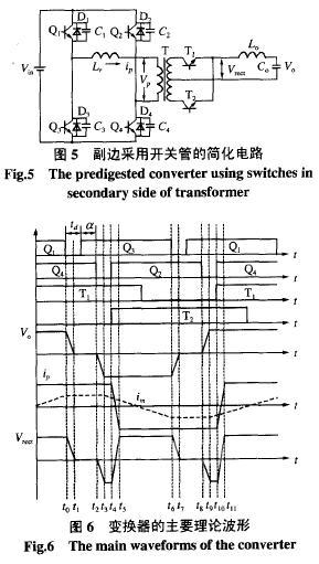 在t4时刻同时开通Qz" T2. T:开通后,变压器副边上、F绕组同时导通,原边电流LP迅速下降,过零后反向增长,同时整流后的电压Vrec,也开始下降,过零后正向增加,如图7('/所示。