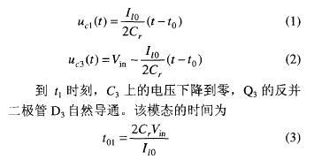 到t3时刻,c2上的电压下降到零,Q:的反并二极管D:自然导通。该模态的时间为
