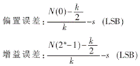 所谓的偏置误差定义为偏置点的理想值与实际值的偏差。A/D的偏置点可以用如下方法求得:当数字输出由0向1转变时,模拟输入值减去1/2 LSB的值。增益误差是指在偏置误差得到修正后,增益点的理想值与实际值的偏差。A/D的增益点是指当数字输出转换到最大值时,模拟输入值加上1/2LSB的值。这两种误差都可以通过修正,调整到0。由定义可以推出偏置误差和增益误差按码出现次数的计算公式如下: