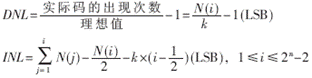 DNL定义为实际转换码宽与理想码宽(1 LSB)的差。INL定义为实际转换点与理想转换点之差,通常要取每个转换码宽的中点与理想转换曲线之差。所谓的理想转换曲线有两种定义,可以是输出转换点的最佳拟合直线,也可以是修正偏置误差和增益误差后的直线,第二种定义由于在计算上很方便所以实际上更常用。按码的出现次数计算,第i个码的DNL和INL值的计算公式为: