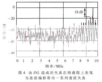 这种测试方法是利用FFT算法对A/D转换芯片的输出码进行数字信号处理,计算A/D的频谱参数,以此看出各种转换误差以及失真在频谱图上表现出的噪声背景。在没有失真的理想情况下,在输入模拟量为正弦波时,输出频谱应为频率等于输入频率的冲激函数的图形。事实上,A/D转换器的量化误差,转换器内部各种噪声,甚至包括测试系统噪声,都会在频谱图上的噪声背景中体现出来;DNL、失码、孔径误差、宽带噪声都会造成频谱图上噪声背景的提升,而INL则会在测试信号的基波偏移带内表现出谐波失真(如图4);转换器内部非线性部件的存在,使输出信号相对于输入信号在频率上不但会有一个微小的偏移,而且会产生一系列的谐波分量(图5)。