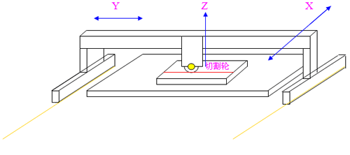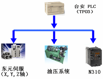 本机械之XYZ三轴由东元servo及油压系统所驱动,台安TP03 PLC为控制器,切割轮由N310驱动,由使用者通过设定面板上VR(电位器)控制调速, PLC通过发送脉冲控制伺服来设定切割行程。