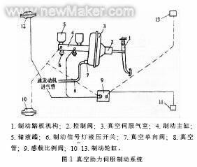 传统制动系包括液压系统(产生制动能量)、控制系统(产生制动动作,控制制动效果,如制动踏板机构等)、传动装置(将制动力传递到制动器的各个部件,如制动主缸、轮缸和液压管路)和制动器(完成制动作用的部件,如制动盘、制动毂、制动蹄等),现代汽车上的制动系还包括助力系统、制动力调节装置(各种阀体)和报警装置等。如图1 所示装有真空助力的制动系统,能够达到有效的制动力,可以减轻驾驶员的踏板力,使制动变得轻松。同时由于道路条件的不同,汽车载荷不同,实施制动的作用力也不同,因此在多数情况下很难获得最合适的制动效应,特别是在紧急制动时,很容易产生侧滑现象,现在广泛使用制动防抱死系统(ABS),使安全性进一步提高。