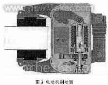 在电子机械制动装置中,其中一种是通过一个大直径的滚珠螺杆机构将电动机的旋转运动转变成压头的直线运动。如图3所示。制动调节器用来控制电动机的运转。制动调节器接收制动防滑控制盒指令和车轮力矩传感器的信号,可以自动调节电动机的电流和电压,从而调节制动力矩。