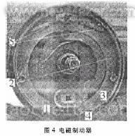 电动制动装置中除了采用电动机外, 还可以使用电磁离合器,使制动盘压紧或松开。新型电磁制动器由电磁体1、制动蹄2、销轴3、制动杠杆4、回位弹簧5 等组成,如图4 所示。