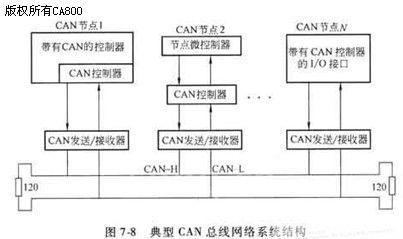 CAN总线系统结构:CAN总线每个节点需要带有CAN协议控制芯片及适当的接口电路,节点之间通过双绞屏蔽线进行总线式连接,首尾节点需要接120R的匹配电阻,通信最高速率可达1MBPS,传输速率越低,传输距离越远。系统结构如下: