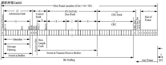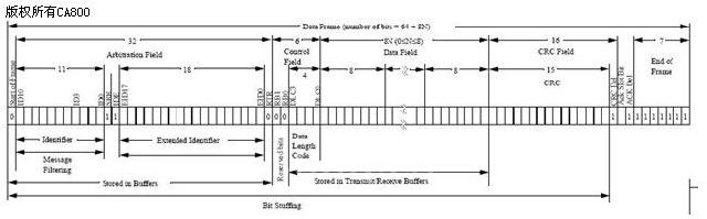 CAN协议的报文格式:CAN协议支持两种报文格式CAN2.0A和CAN2.0B; CAN2.0A为标准格式,CAN2.0B为扩展格式;格式分别如下: