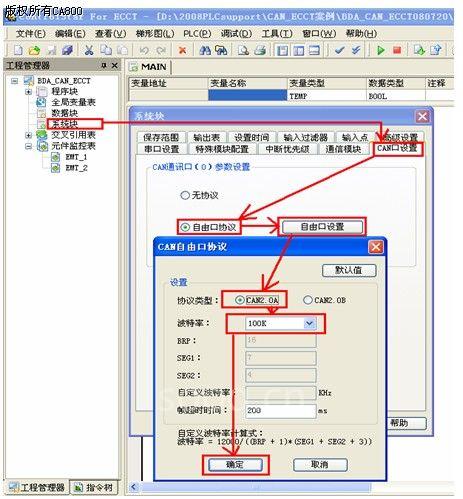 1)基本设置:在工程管理器里双击“系统块”,在弹出的窗口选择“CAN口设置”,在“CAN口参数设置”里选择“自由协议”,然后单击后面的“自由口设置”按扭。在弹出的窗口选择协议类型“2.0A”或“2.0B”,然后再下拉选择“波特率”最后单击“确定”,把系统块下载到PLC里。