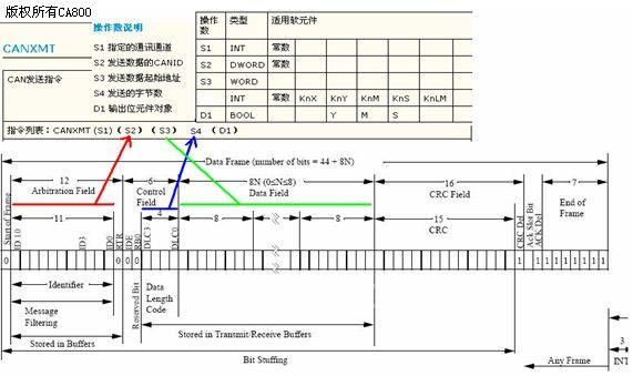2)数据发送:使用指令CANXMT,并以CAN2。0A协议为例描绘了它们之间的对应关系。
