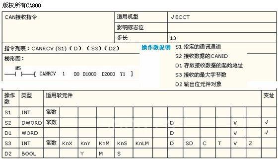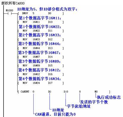 其中要注意的是:1)CANXMT为上升沿执行指令,M1000为指令执行条件,当其出现OFF—>ON的变化时,执行CANXMT指令;2)使用CANXMT指令前先把该赋值的地址写好;3) 发送数据只取D元件的低8位; 4)网络上没有CANID、数据完全相同的CAN帧同时出现;5)ID保留0。6)CAN程序的校验部分全部由硬件自动完成,用户程序不需要参与。