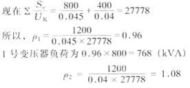 两台阻抗电压不相同的变压器并联运行时,阻抗电压大的变压器(1号)分担负荷偏低;阻抗电压小的变压器(2 号)分担负荷偏高。这将影响变压器的经济运行。为限制2 号变压器过负荷,必须降低总负荷,使ρ1、ρ2都小于或等于1。若ρ2=1,则S=1×0.04×27778=1111(kVA)时,2 号变压器将分担400kVA;1 号变压器为1111—400=711(kVA)。