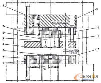 为了提高模具使用时的稳定性,卸料板4既是卸料板又是凸模保护套,小导柱11有4个,它与凸模固定板采用H7/r6紧配合,与卸料板采用Hg/h6滑配合,与凹模采用HS/h6滑配合。这样4个小导柱就将3块板连在一起(凸模固定板、卸料板、凹模),起到了定位和导向作用,增加了模具刚性和稳定性。为尽量减小凸模长度没有采用橡胶卸料,而是采用强力弹簧8,即用8个强力弹簧装在上模板上,通过顶杆5卸料。零件通过定位销3定位。