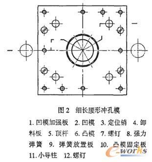 模具结构如图2所示,腰形冲孔模是保证该零件加工制造成功的技术关键。由于零件料厚6mm,6个细长腰形孔之间的孔过止巨只有5mm氏零件生产批量又大,凸、凹模工作部分结构、刚度及强度尤为重要,要保证厚料冲小孔的连续进行,就必须提高凸、凹模工作时的强度和刚度,同时还要保证整副模具的刚性和稳定性。