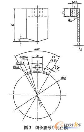 方案(1)由于分2次冲制6个细长腰形孔,由机械加工3个圆环形凹槽。该方法多了1道冲孔工序且采用机械加工圆环形凹槽,故零件生产周期长费用高,且6个腰形孔位协调性较差,因此该方案虽可行但不可取。