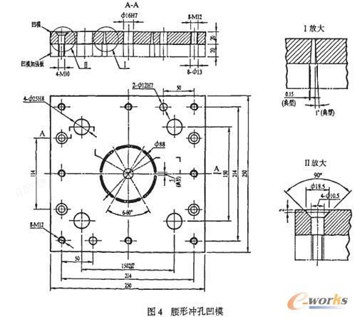 由于一次冲制6个细长腰形孔,孔与孔之间的边距仅为5mm、小于6mm的材料厚度。为了降低冲裁力和推件力,凹模刃口也做成斜刃;为了延长凹模寿命,凸、凹模单边间隙取0.4mm;为了达到快换的目的,凹模用4个M10沉头螺钉固定在凹模加强板上;为了增加凹模强度,在凹模下面加了1块凹模加强板。冲孔凹模见图4。