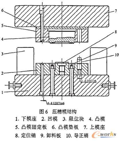 压槽模结构见图6。工作时将冲孔落料后的毛坯用定位销8定位在凹模上,凸模下行时先将毛坯压入凹模框,凸模继续下行,由于毛坯的内孔和外圆均被凹模约束,毛坯在液压机的巨大压力下(450kN),材料产生塑性变形。凸模上的3个凸槽在液压机的压力下将毛坯冷挤压出3个凹槽,槽深在1mm左右。限位块3避免压槽过深,可通过试模确定限位块高度。凸模压至下止点后上行,这时气垫通过顶杆、卸料板将毛坯顶出。