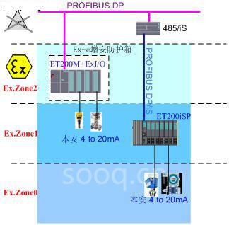 与从总线到总线(Bus to Bus) 解决方案相比,其应用特点是:现场仪表仍可以采用传统4~20mA本安仪表,以点对点的接线方式接至分布式I/O,而分布式I/O向上则以经本安链接器485/iS隔离后的PROFIBUS-DP/iS(1.5Mbps)总线方式接至控制系统通信总线或现场总线网卡。ET200iSP不仅具有安全栅功能,为现场回路提供本质安全防爆,而且ET200iSP本身还具有很高的防爆安全等级,其I/O模块、电源模块和网关本身也采用本安防爆(ATEX II 2 G EEx ib IIC T4)。 因而ET200iSP可以直接安装在 1区,可对其所有电子模块(包括电源模块和总线连接模块)进行带电热插拔维护、操作。显然,这种本安防爆解决方案中,现场仪表仍可使用传统的4—20mA仪表。本安防爆远程分布式I/O方案是能兼顾FISCO现场总线方式和点对点方式两类应用方案优点的一种中间方案,也是本文将详细讨论的方案。