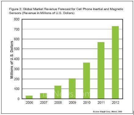 实际上,导航手机是手机惯性传感器的下一个领域。GPS的应用在增长,iSuppli公司预测,从2010年开始,手机和智能手机将成为导航应用最大平台,超过便携导航设备(PND)和其它类型的导航产品。