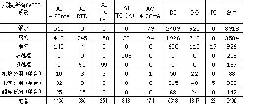 单元机组I/O点约为9400点,电动调门约75个,电动关断门(含部分气动关断门)约240个,400V及以下电机约110个,6kV电动机约22个,每对通讯口带电动门数量按不超过15、每个通讯口带电动机数量按不超过10个。单元机组I/O点列表如下:
