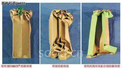 陶氏曾做了一个轴向落锤试验:将3个分别由BETAMATE结构胶、焊接以及传统的环氧粘合剂粘接的箱体梁,同时以20英里/小时的速度从高处落下。结果,用BETAMATE粘接的部件完好无损,焊接的部件发生了严重的变形,而使用了环氧粘合剂的部件甚至出现了开裂。乐传华先生介绍说,由于新一代的BETAMATE抗碰撞结构胶具有较高的韧性,因而可提供良好的抗碰撞性能,且不会引起重量的增加。在替代昂贵的焊接工艺方面,它不仅有助于降低成本,而且避免了焊缝问题的出现。