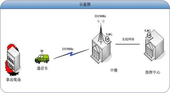指挥车通过大功率无线移动发射设备将图像信号发射到中继点,中继点作为系统的信号转发站,中继点通过无线移动接收设备将指挥车上的视音频信号接收后,再通过音视频电缆送到视频编码器转化成网络数字信号,然后信号再通过网络双绞线送入到无线网桥,中继点的无线网桥将全部信号发射到指挥中心,到达指挥中心的MPEG2数字信号即可以转换成模拟信号在大屏幕显示输出,也可以通过网络直接在网络中进行传输,用户经过授权后可通过控制软件在网络上任何一台电脑上进行显示。指挥中心还可通过网络等有线或无线方式将视音频传输到支队相关领导及市政府相关单位。