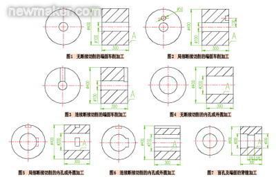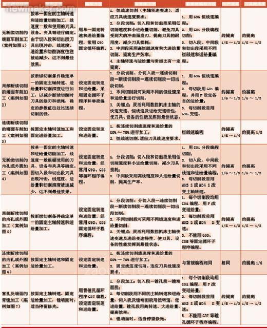 东风柳州汽车有限公司经过近15年应用数控机床的实践与探索,逐步摆脱传统加工工艺和加工编程编制方法的约束,找到一种有效提高生产效率、降低加工成本的方法。根据各种不同类型的零件,按加工部位的形状进行分类,可分成如表所列的典型类型,在零件的加工过程中,在设备、刀具和夹具已确定的前提下,线速度、进给量和切削深度是影响生产效率、刀具耐用度、表面粗造度及尺寸精度的主要变量,因此,灵活地运用非常规的加工工艺和编程方法解决好它们之间的关系,可提高生产效率,降低加工成本,为直观阅读现列表进行介绍。