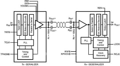 高达24位元的并行资料和时脉输入串列器(DS90C241)。串列器将并行资料转换成串列化资料(24:1),使其能够通过低成本的铜互连线构成的差动对(双线)进行发送。除并行资料外,时脉(CLK1和CLK0)和其他维持直流平衡和连结完整性(DCB和DCA)所必须的附加位元也与实际的资料位元一起被串列化(参见图2)。将时脉嵌入到资料中,能消除当资料和时脉在解串器一侧被恢复时,可能会产生和引起资料错误的时脉到资料边沿歪斜问题,并从中获得关键性的好处。