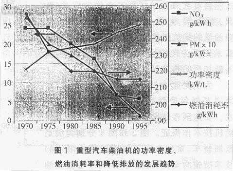 促进重型汽车柴油机发展的主要因素有功率密度、燃油经济性和环境保护。涡轮增压进气中冷技术能显著提高功率密度、降低排放和改善燃油消耗率。与1980年以前的机型相比,现今的重型汽车柴油机的功率密度提高了100%,燃油消耗率改善了16%,NOX和微粒物的排放分别降低了80%和90%。图1为重型汽车柴油机功率密度、燃油消耗率和降低排放的发展趋势。