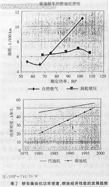 促进轿车柴油机发展的主要因素是排放、功率密度、性能、噪声和燃油经济性。图2为轿车柴油机功率密度、燃油经济性能的发展趋势。