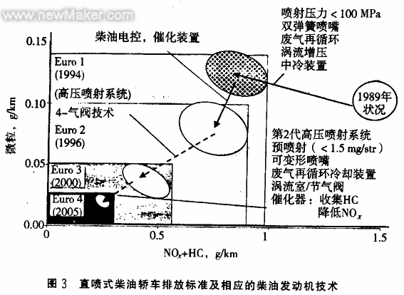 具有代表性的国际三大排放体系(欧洲、美国、日本)分别制定了分阶段的汽车柴油机的排放限值。虽然三个排放法规体系采用了各自的测试方法和阶段限值,但不断加严的趋势是一致的。