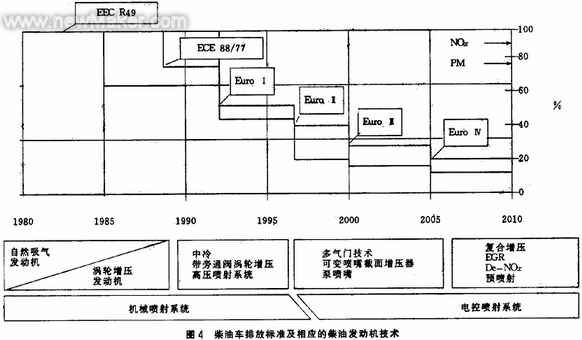 为满足越来越严的排放法规要求,必须提高燃料质量和采用先进的发动机技术。要达到各阶段排放限值需有相应的发动机技术作保证。图3和图4分别为满足欧洲轿车、重型汽车不同阶段排放限值的技术措施的实例。由图可知,对于各型柴油车,既要稳定达到高于欧洲Ⅰ的排放标准,又要保证汽车柴油机优良的动力和燃油经济性,必须采用废气涡轮增压及中冷技术。对应于不同的排放限值阶段,除了采用其他先进技术,诸如高压喷射、多气门技术、泵喷嘴、EGR、预喷射、电控喷射、De-NOX催化器等技术外,各阶段都对应一定的增压技术的改进和提高。
