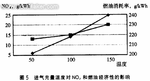 采用进气中冷技术降低进气温度,可降低增压柴油机NOX排放;特别采用先进的空--空中冷后,可进一步降低进气充量的温度。进气充量温度降低,燃烧温度可以得到有效控制,有利于NOX的减少。如图5所示,随着中冷后的进气温度的降低,NOX和燃油消耗率都有所改善。