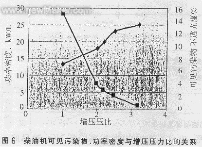 d)微粒物(PM)。影响柴油机微粒物生成的原因较复杂,其主要因素是过量空气系数、燃油雾化质量、喷油速率、燃烧过程和燃油质量等。此外,柴油机机内净化降低NOX的措施通常会带来PM增加。增压柴油机,特别是采用高增压压比和空--空中冷技术后,可显著增大进气密度,增加缸内可用的空气量。如同时采用高压燃油喷射、共轨电控喷射、低排放燃烧室和中心喷嘴四气阀技术,并提高燃油雾化质量,改善燃烧过程,则可有效地控制PM排放。试验数据表明,采用增压中冷技术的柴油机可降低PM排放约45%。在大负荷区,与微粒物排放密切相关的可见污染物排放,也随着柴油机增压压力比的增大而显著下降,如图6。