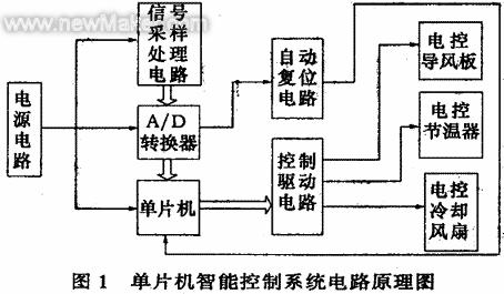 单片机智能控制系统电路原理图如图1所示,主要包括微控制器、电源电路、信号采样处理电路、A/D转换器、自动复位电路和控制驱动电路。