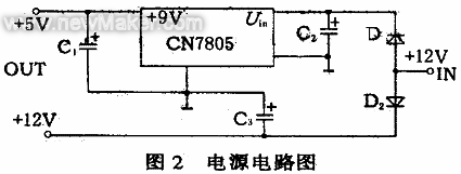 直流电源+12V经芯片CN7805转换,得到+5V稳定直流电压,与直流电源+12V构成一个二级输出电源。 此外外接有滤波作用的电容器和隔离作用的二极管,从而使输入电压稳定和输入信号可靠。如图2所示。