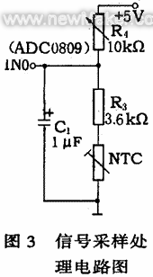 采用负温度系数热敏电阻NTC,其温度值与模拟电压信号成反比。模拟电压信号经电容器滤波后送入ADC0809的INO模拟信号通道。如图3所示。