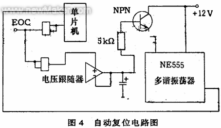 当系统运行出现错误时,ADC0809的EOC(中断申请)信号经2个与非门和由运放器构成的电压跟随器的处理得到一高电平信号,此信号把三极管基极钳到高电位,三极管导通,由NE555组成的多谐振荡器开始向单片机发出复位脉冲,使单片机复位,此时系统会避开错误操作而返回到正常状态。系统恢复正常状态后,NE555在EOC信号的控制下便会停止工作。如图4所示。