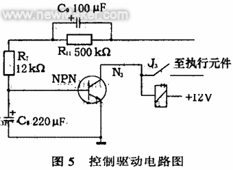 单片机,输出的控制信号首先送入由电容器和电阻构成的延时电路,经过延时处理后,再送入继电器驱动三极管基极,最后由驱动三极管控制执行元件用继电器,从而控制执行元件。如图5所示。