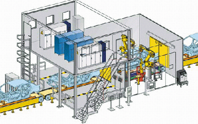 相对于传统的生产工艺而言,薄板激光拼焊技术具有一定的优势,并且已经是一种相当成熟的工艺,可以降低汽车的制造成本。而就车身在线的焊接工艺来说,激光焊接设备相对于传统焊接技术的成本仍相当昂贵。对于一个典型的激光焊接工位(如图4),包括两套激光发生器、冷却箱、激光头,两台机器人及相应的机运线和外部封闭等,大约需要200~300万美金。