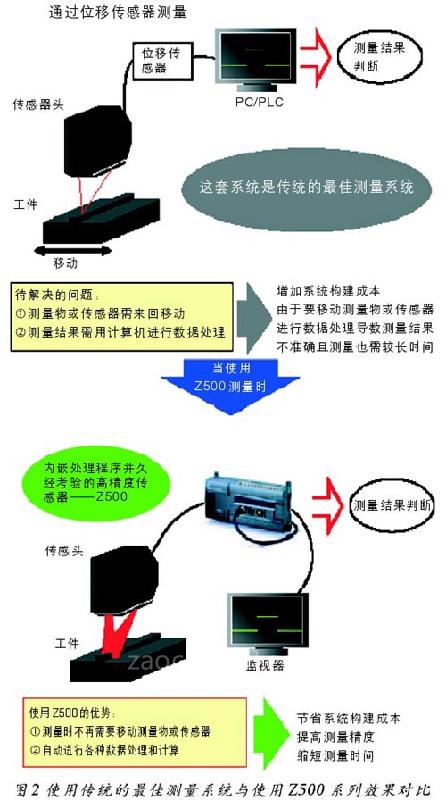 欧姆龙利用独特的激光技术、二维平面CCD技术和“线型光束方式”的Z500系列形状测量传感器(见图1),彻底解决了在汽车制造领域一直以来存在的非接触性测量问题,实现了汽车生产工序中高速、高精度的线上测量检查。Z500系列能够稳定地测量种类繁多的项目,灵活地应用于各式各样的设备中。与传统的最佳测量系统相比,Z500系列具有很多无法比拟的优势(见图2),下面结合Z500系列形状测量传感器在汽车制造中具有代表性的应用实例进行介绍。